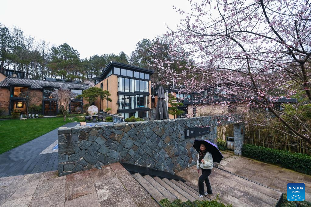 A tourist enjoys cherry blossoms at a hostel in Qianyuan Village of Sandu Township, Jiande, east China's Zhejiang Province, Feb. 28, 2023. In recent years, Sandu Township has helped local residents increase their incomes by promoting seasonal sight-seeing routes which feature mountain cherry blossoms, camping sites and hostels. (Xinhua/Xu Yu)