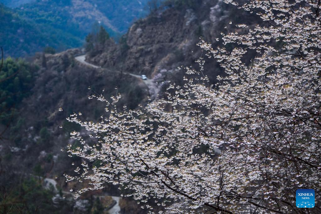 This photo taken on Feb. 28, 2023 shows cherry blossoms in Qianyuan Village of Sandu Township, Jiande, east China's Zhejiang Province. In recent years, Sandu Township has helped local residents increase their incomes by promoting seasonal sight-seeing routes which feature mountain cherry blossoms, camping sites and hostels. (Xinhua/Xu Yu)