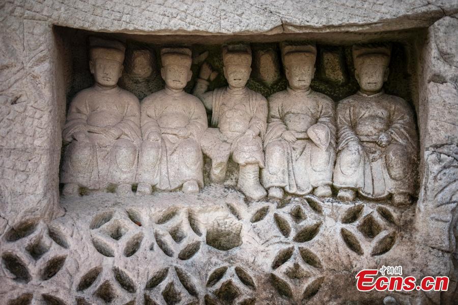 Stone sculptures dating back to Tang (618-907) and Song Dynasty (960-1279) emerge after water level lowers at Anyue County, southwest China's Sichuan Province, March 1, 2023. (Photo: China News Service/Liu Zhongjun)