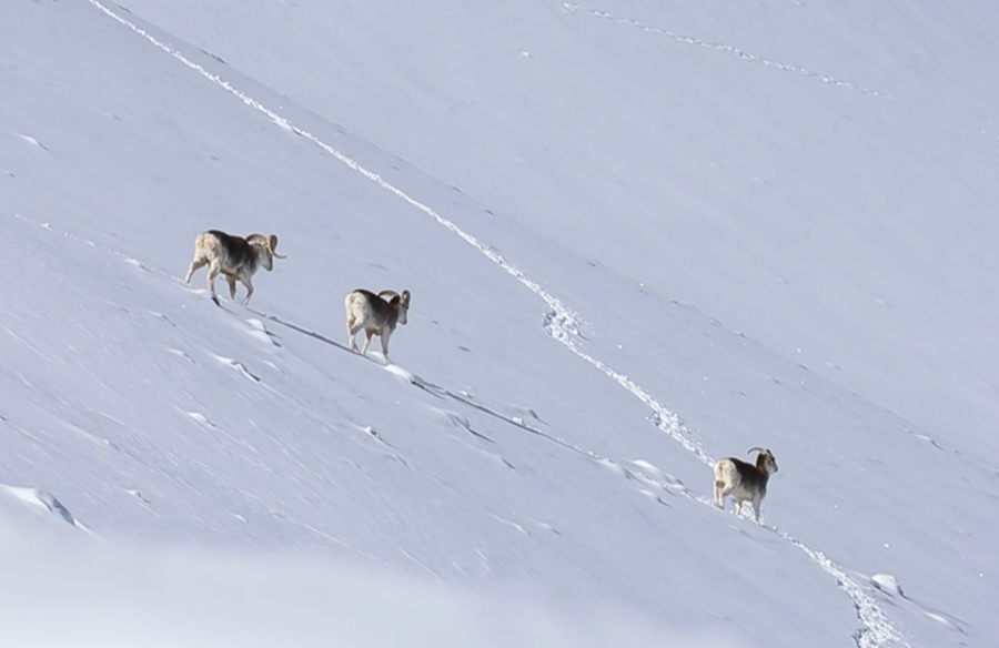 Photo shows three Marco Polo sheep on the snow-covered Pamir Plateau. (Photo/Tayirjan Kerimjan)