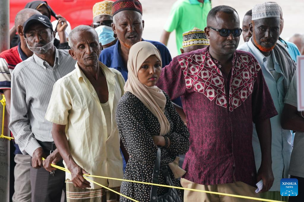 Local patients and their company queue up to consult doctors at Peltier General Hospital in Djibouti City, Djibouti, on Feb. 28, 2023. Early in the morning, about 20 people suffering from cataract gathered at two mobile eye treatment centers at Peltier General Hospital in Djibouti City, the capital of the Red Sea country, to register and have examinations before a Chinese medical team conducted surgery for them.(Xinhua/Han Xu)