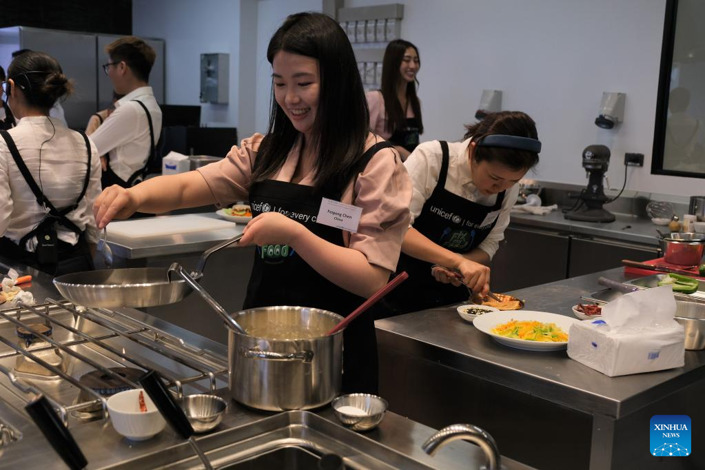 Chen Feipeng (C), a 24-year-old Chinese postgraduate student, takes part in the UNICEF-supported "Fix My Food" campaign in Bangkok, Thailand, Feb. 27, 2023. Youth and celebrities from eight countries, including China, took part in a UNICEF-supported campaign in Bangkok this week, to promote the need for healthier food environments in the Asia-Pacific. (UNICEF China/Handout via Xinhua)