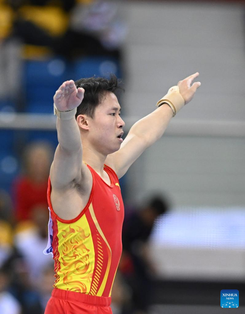 Xiao Ruoteng of China competes during the men's floor exercises qualifying round at the 15th FIG Artistic Gymnastics World Cup in Doha, Qatar, March 1, 2023. (Photo by Nikku/Xinhua)