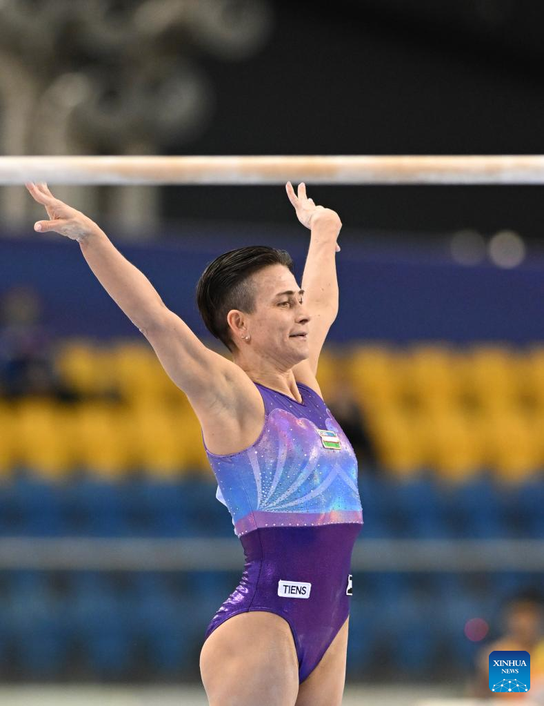 Oksana Chusovitina of Uzbekistan competes during the women's uneven bars qualifying round at the 15th FIG Artistic Gymnastics World Cup in Doha, Qatar, March 1, 2023. (Photo by Nikku/Xinhua)