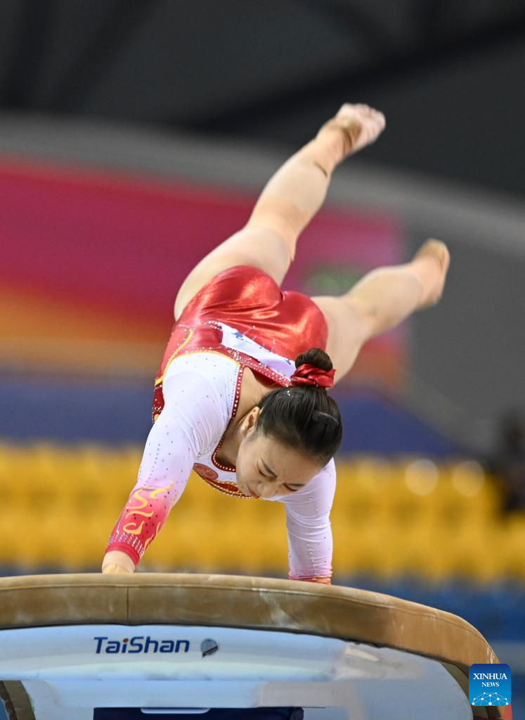 Yu Linmin of China competes during the women's vault qualifying round at the 15th FIG Artistic Gymnastics World Cup in Doha, Qatar, March 1, 2023. (Photo by Nikku/Xinhua)