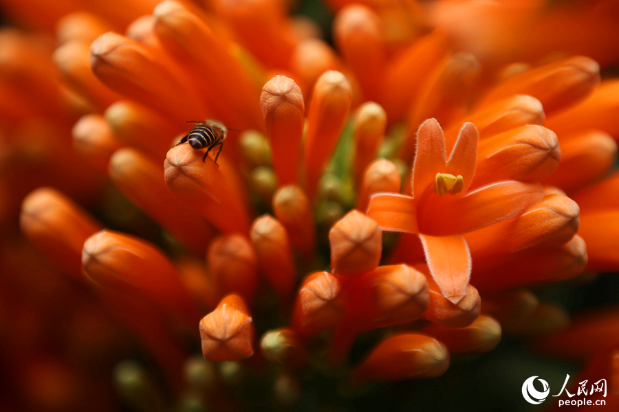 A bee gathers nectar in a cluster of orange trumpet vines in Xiamen, southeast China’s Fujian Province. (People’s Daily Online/Chen Bo)