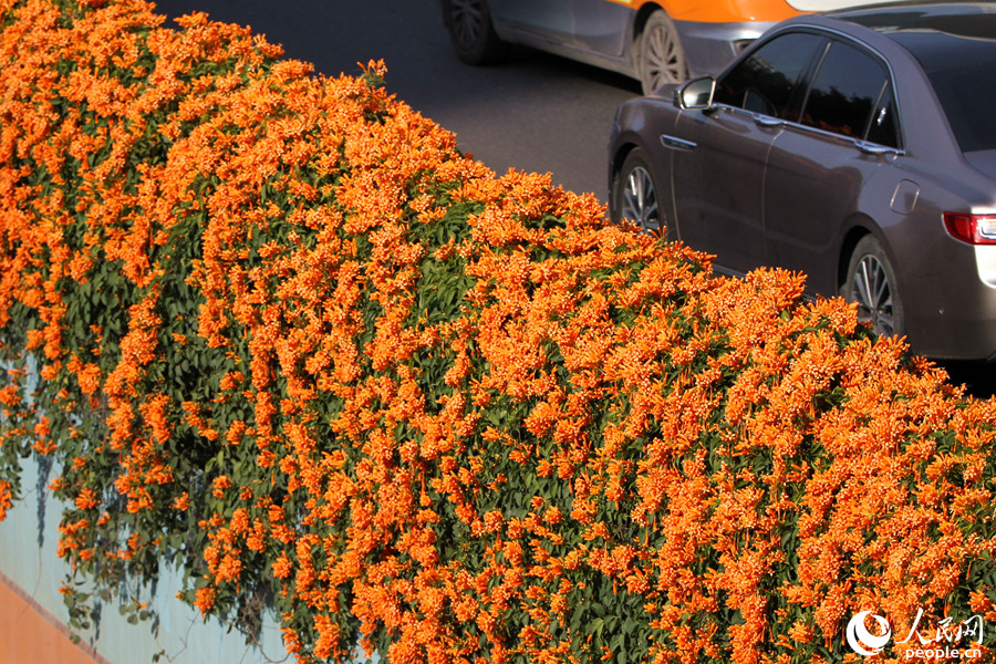 Photo shows blooming orange trumpet vines beside a road in Xiamen, southeast China’s Fujian Province. (People’s Daily Online/Chen Bo)