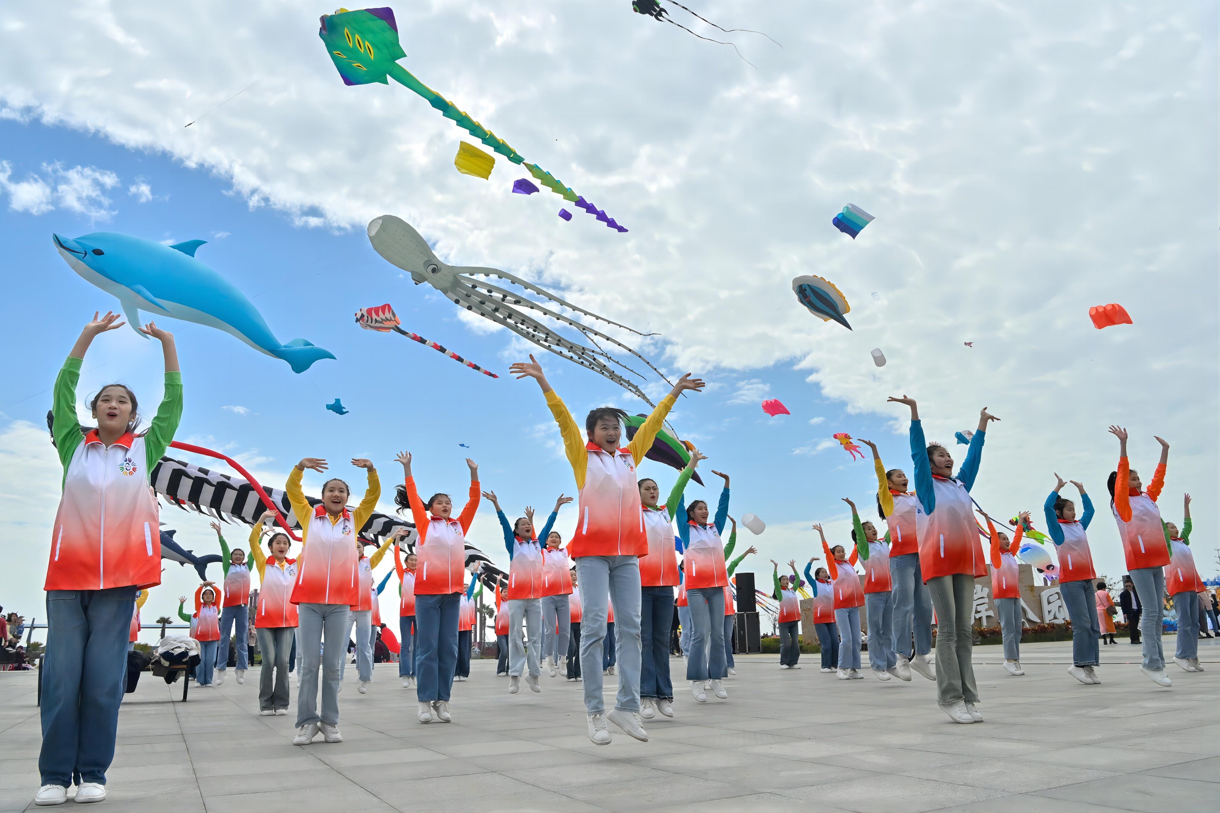 Teenagers dance under a sky decorated with colorful kites at a park in Shantou, south China’s Guangdong Province. (Photo/Chen Shi)