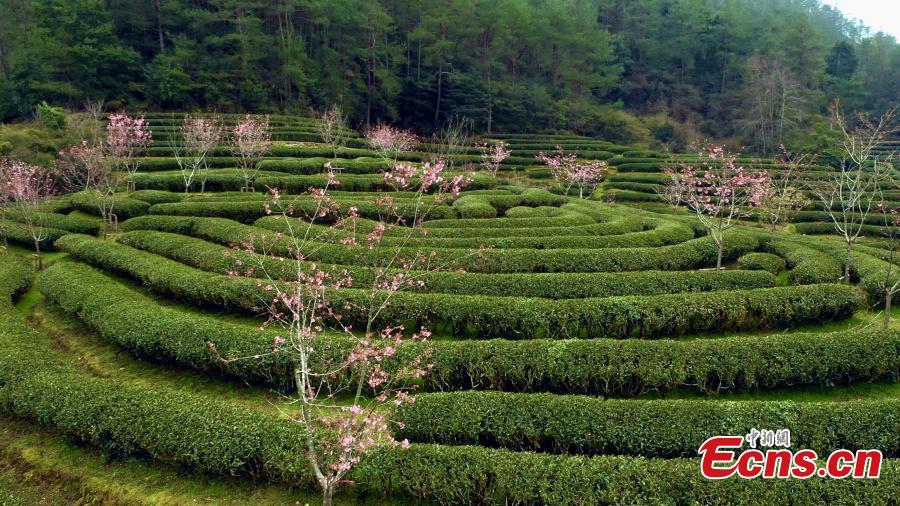 Cherry blossoms are in full bloom at a tea garden in Wuyishan National Park is shrouded by morning mist in east China's Fujian Province, March 1, 2023. (Photo: China News Service/Zheng Guohu)