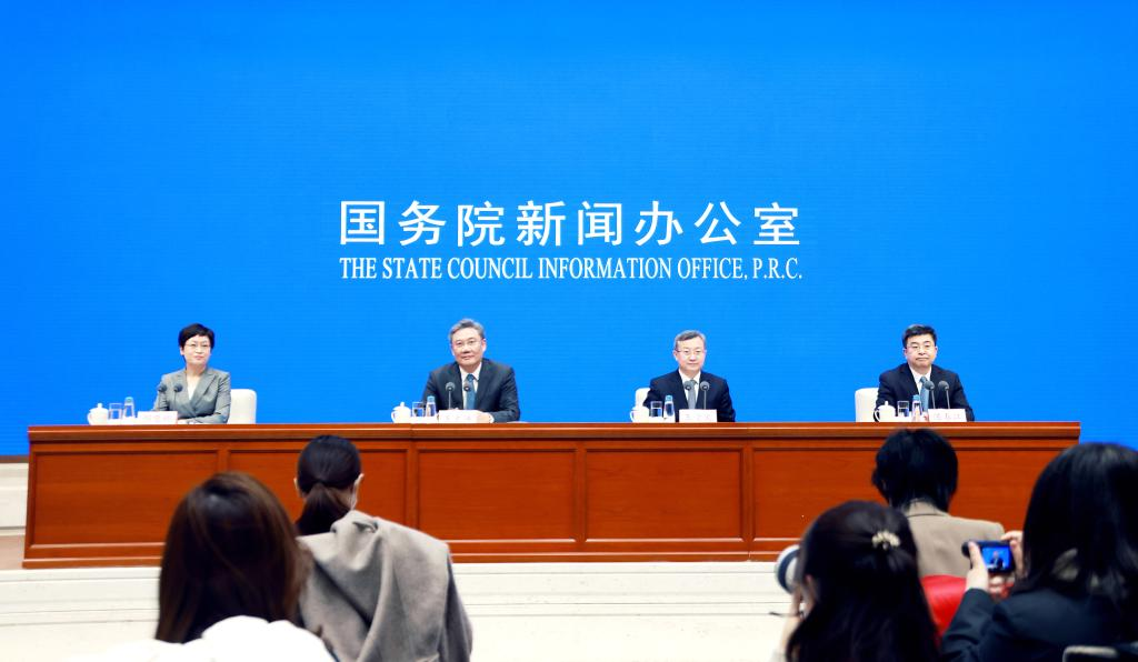China's Commerce Minister Wang Wentao (2nd L), Vice Commerce Minister Wang Shouwen (2nd R), and assistant minister of commerce Chen Chunjiang (1st R) attend a press conference on building up confidence, making great efforts, and taking new steps for high-quality development of commerce held by the State Council Information Office in Beijing, capital of China, March 2, 2023. (Xinhua/Pan Xu)