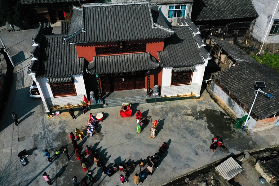 A troupe of Dong Opera gives a performance in Tianzhu County, southwest China's Guizhou Province, Feb. 26, 2023. (Xinhua/Yang Wenbin)