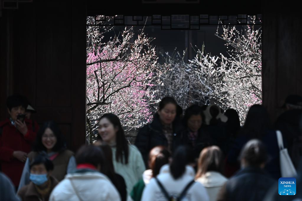 Tourists enjoy plum blossoms on boats at the Xixi National Wetland Park in Hangzhou, east China's Zhejiang Province, on Feb. 18, 2023. (Xinhua/Weng Xinyang)