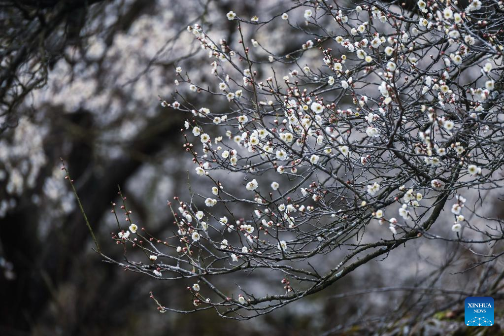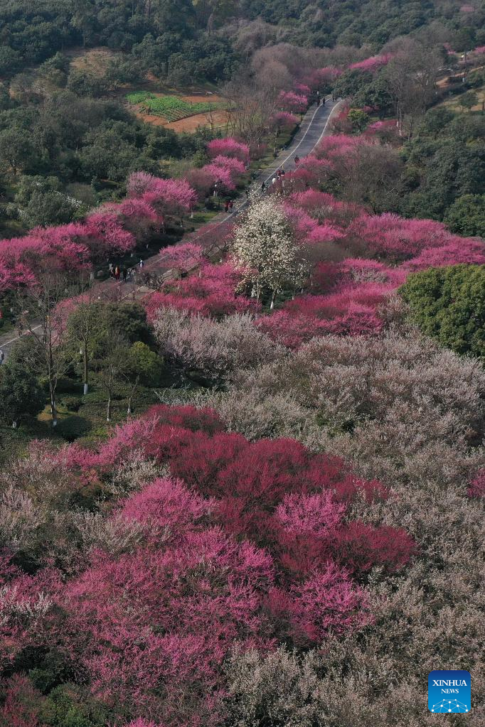 This aerial photo taken on Feb. 28, 2023 shows plum blossoms blooming at Hangzhou Botanical Garden in Hangzhou, east China's Zhejiang Province. (Xinhua/Jiang Han)