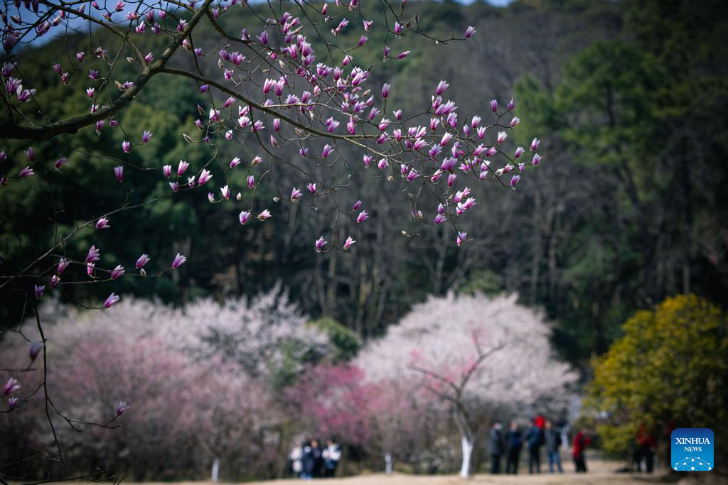 This photo taken on Feb. 28, 2023 shows magnolia and plum blossoms blooming at Hangzhou Botanical Garden in Hangzhou, east China's Zhejiang Province. (Xinhua/Jiang Han)