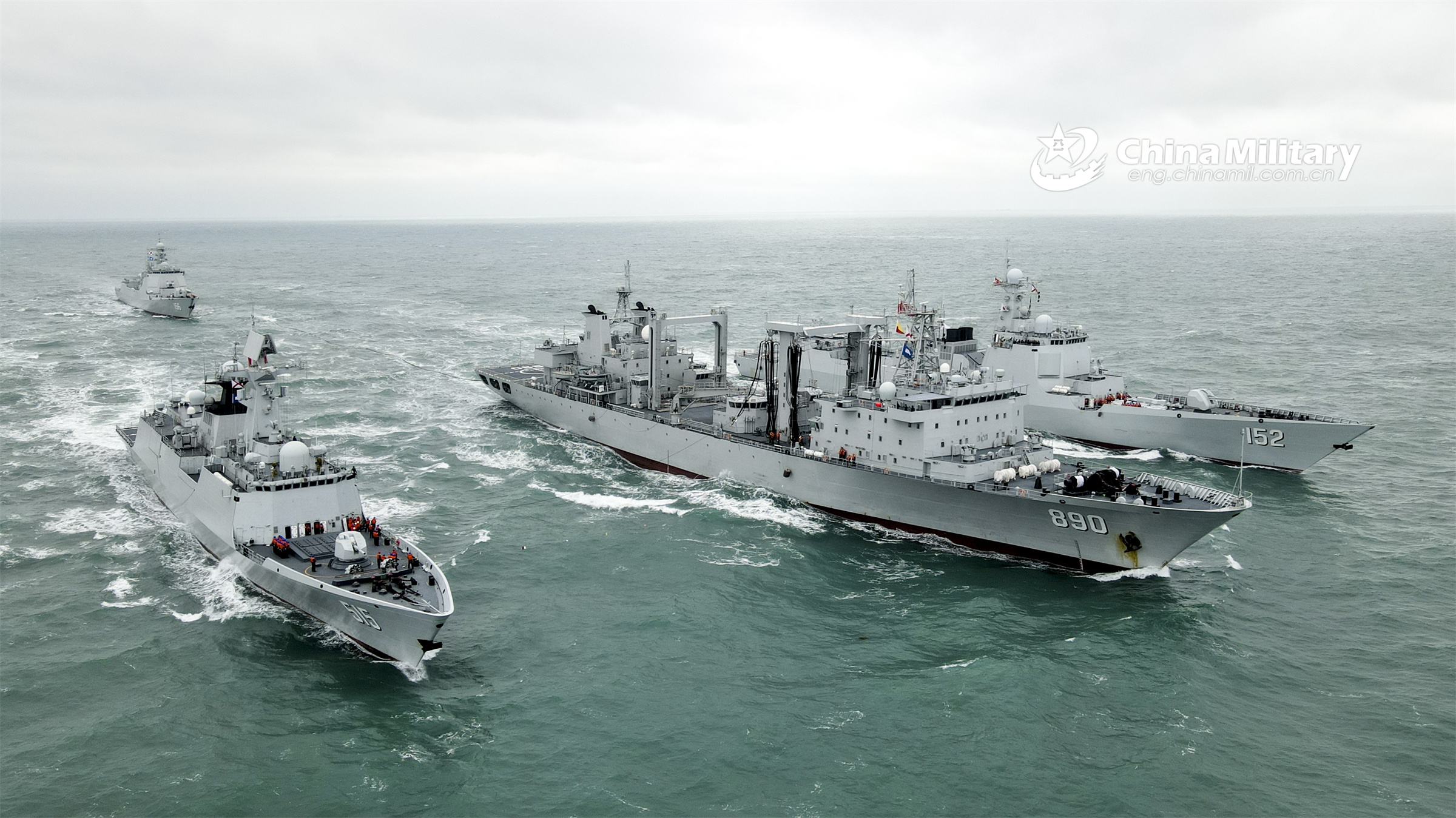 Naval ships assigned to flotillas with the navy under the PLA Eastern Theater Command steam in formation to conduct alongside and astern replenishment-at-sea during a comprehensive replenishment training exercise on February 10, 2023. (eng.chinamil.com.cn/Photo by Zhang Weile)