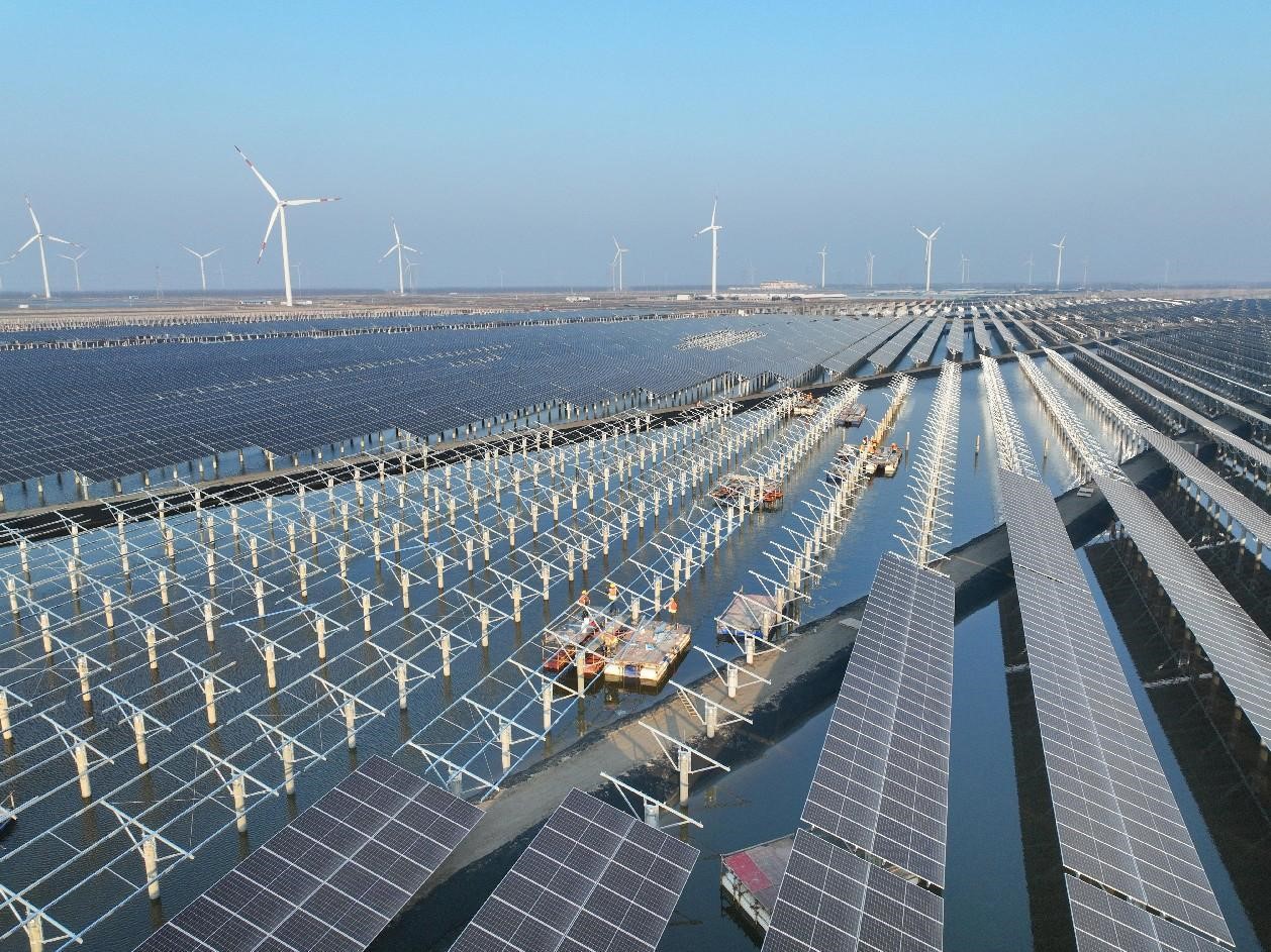 Photovoltaic panels are installed in a fish farm in Rudong county, Nantong, east China's Jiangsu province, Feb. 20, 2023. (People's Daily Online/Xu Congjun)