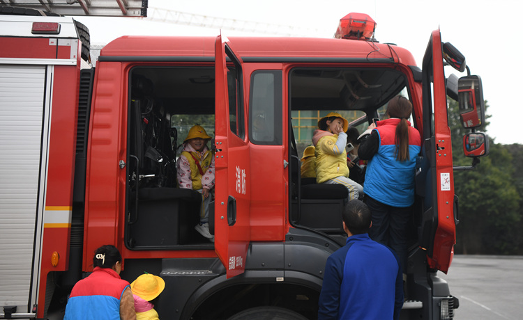 Photo shows children getting into a fire truck’s cab at a fire station in Tianxin district, Changsha, central China’s Hunan Province. (Photo courtesy of Hunan provincial fire and rescue team)