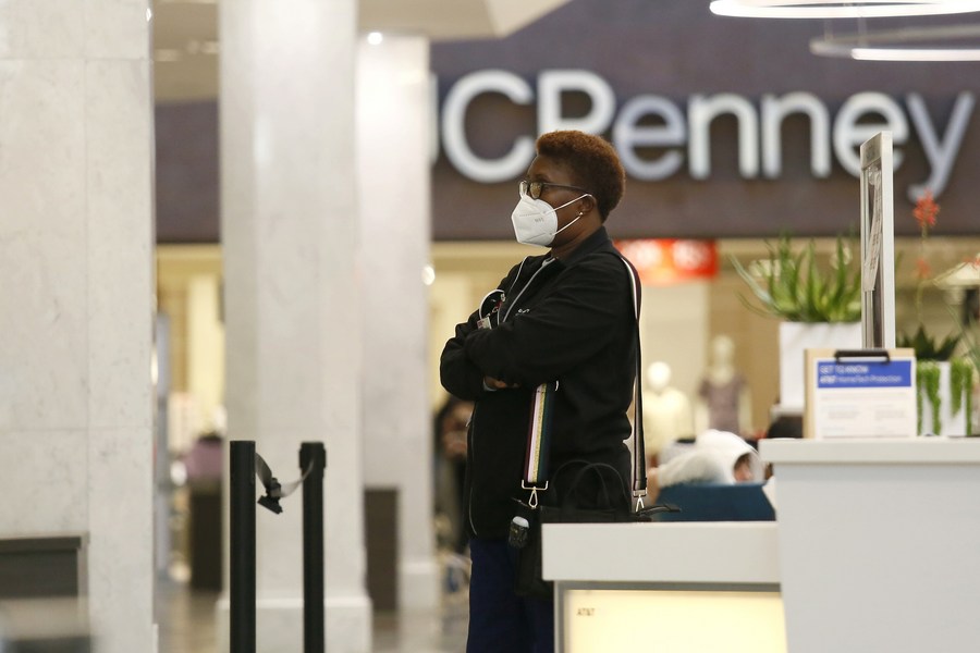 A woman wearing a face mask waits in line outside a store in a shopping center in New Orleans, Louisiana, the United States, Jan. 11, 2022. (Photo by Lan Wei/Xinhua)