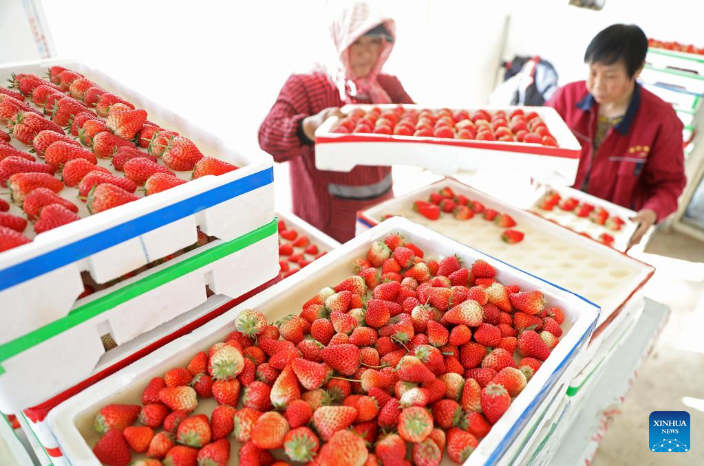 Villagers arrange freshly-picked strawberries in Tai'an, northeast China's Liaoning Province, March 2, 2023. Strawberries have entered the harvest season in Tai'an County. Villagers are busy picking strawberries to meet market demands. (Xinhua/Yao Jianfeng)