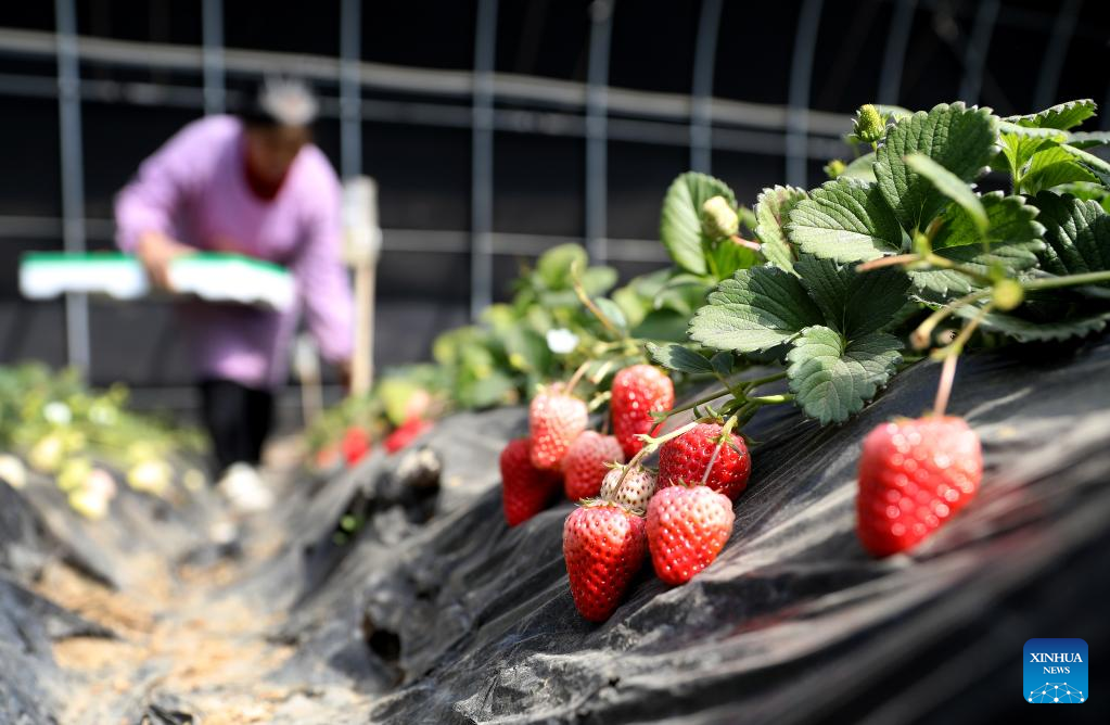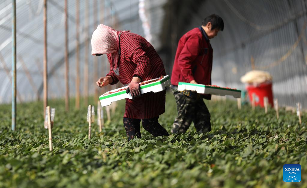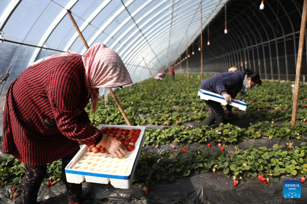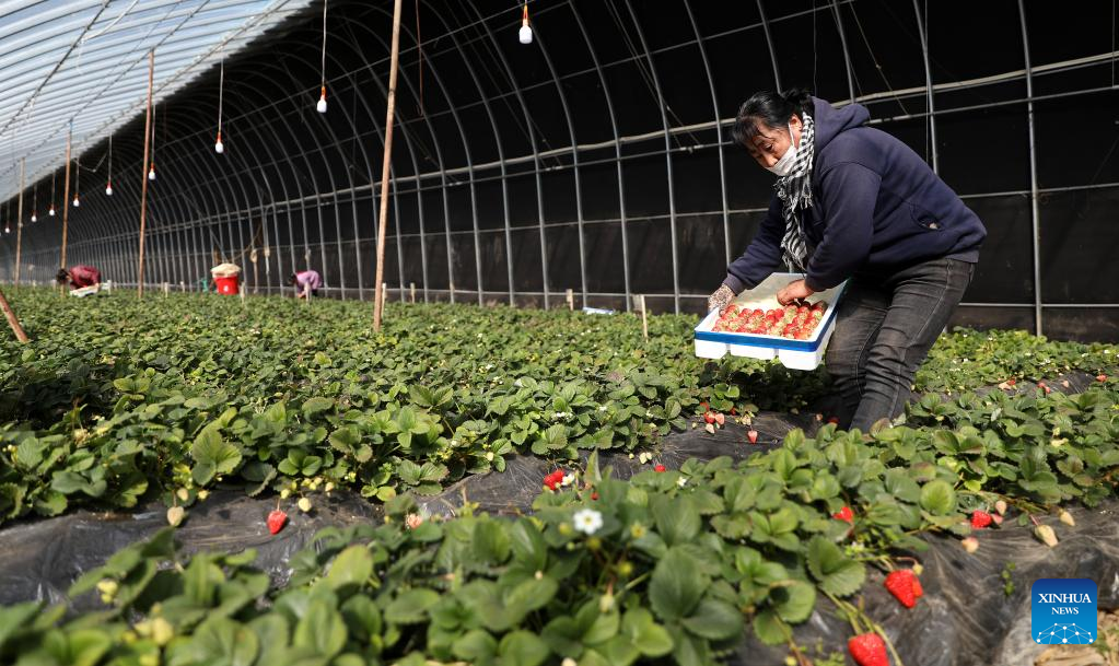 Villagers pick strawberries in a greenhouse in Tai'an, northeast China's Liaoning Province, March 2, 2023. Strawberries have entered the harvest season in Tai'an County. Villagers are busy picking strawberries to meet market demands. (Xinhua/Yao Jianfeng)