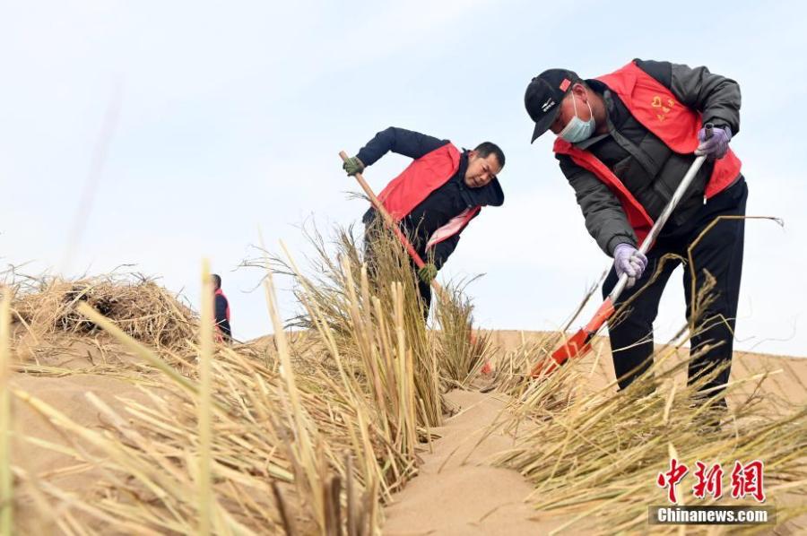 Locals make straw checkerboard sand barriers to combat desertification in Wuwei, northwest China's Gansu Province, March 2, 2023. Gansu has taken effective measures in fighting against desertification. (Photo/China News Service)