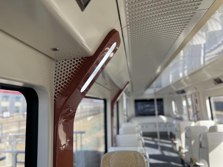 Energy-saving lights inside the hybrid light rail train. [Photo by Zhang Yan/For chinadaily.com.cn]