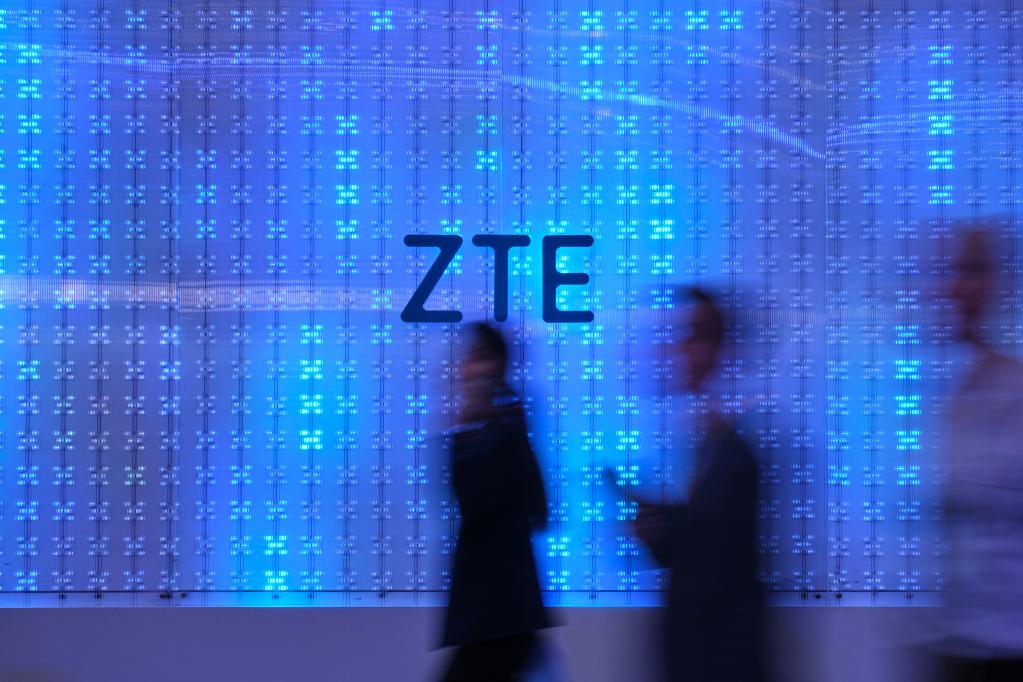Visitors walk past the booth of ZTE at the 2023 Mobile World Congress (MWC) in Barcelona, Spain, March 1, 2023. (Xinhua/Meng Dingbo)