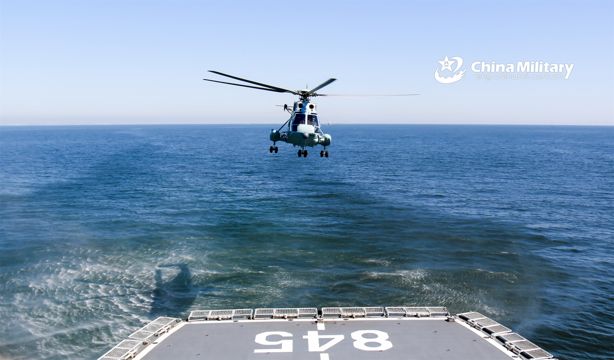 A ship-borne helicopter assigned to the PLA Naval Aviation University conducts joint search and rescue with a vessel assigned to a naval flotilla under the PLA North Theater Command during a combat rescue exercise on February 10, 2023. (eng.chinamil.com.cn/Photo by Hu Jiajie)