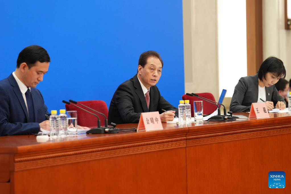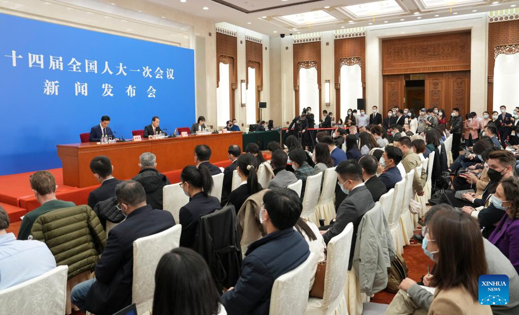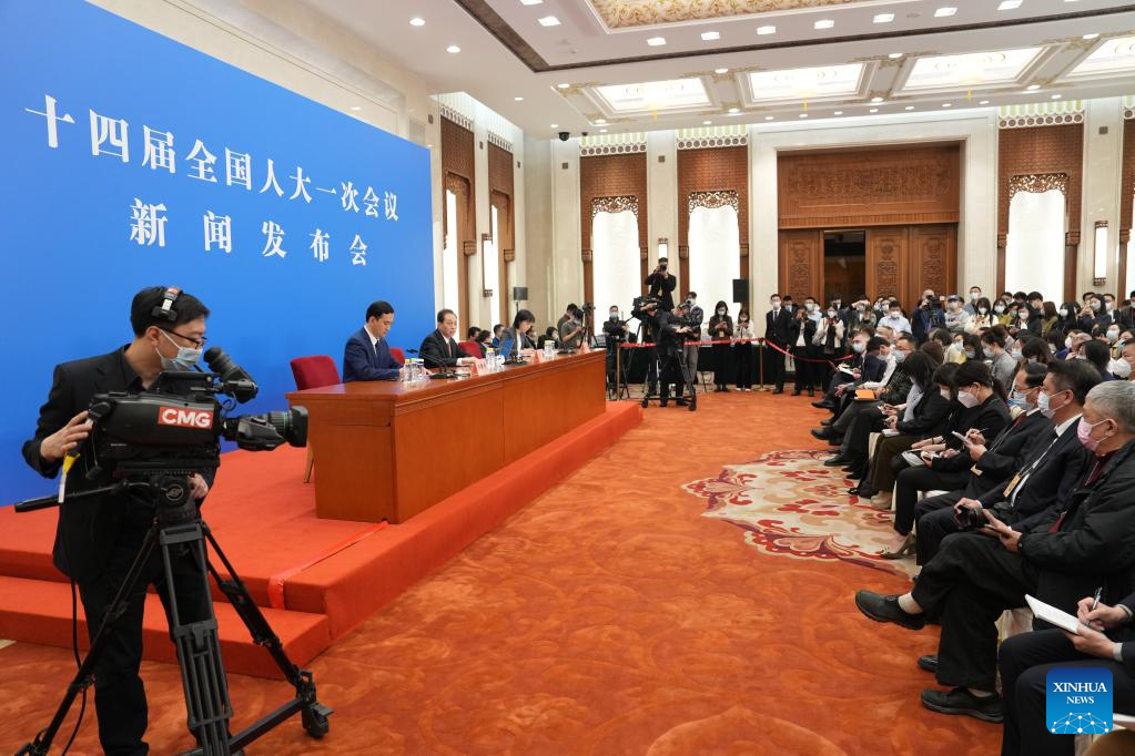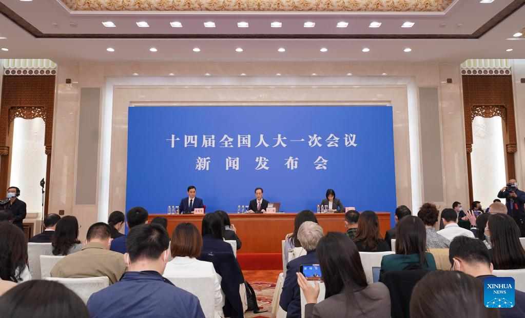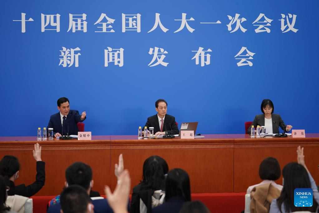 Wang Chao (C), spokesperson for the first session of the 14th National People's Congress (NPC), attends a press conference at the Great Hall of the People in Beijing, capital of China, March 4, 2023. The NPC, China's national legislature, held a press conference Saturday, one day before the opening of its annual session. (Xinhua/Cai Yang)