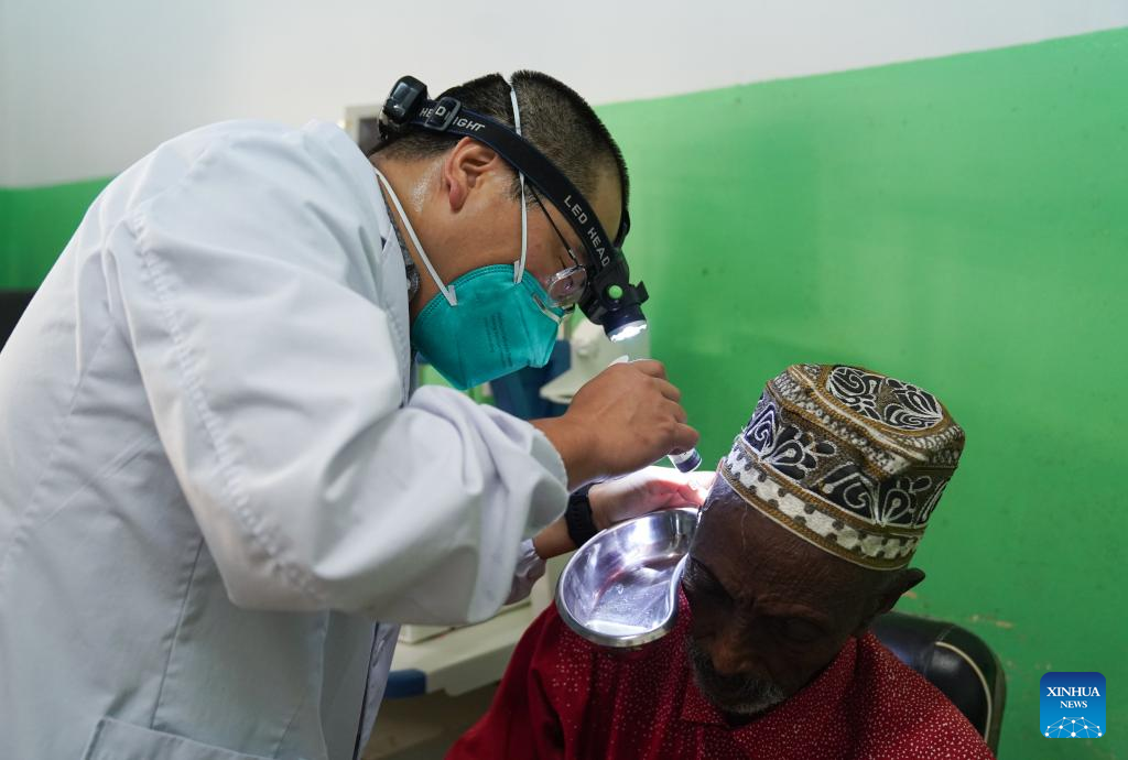 Hou Wei, a member of the 21st Chinese medical team dispatched to Djibouti, provides medical treatments for a patient at the Peltier General Hospital in Djibouti City, Djibouti, March 1, 2023. The 21st Chinese medical team dispatched to Djibouti has been providing medical services at the Peltier General Hospital since January 2022. By the end of February 2023, the medical team had provided 14,658 outpatient services, 576 emergency services and completed 1,168 surgeries. (Xinhua/Han Xu)