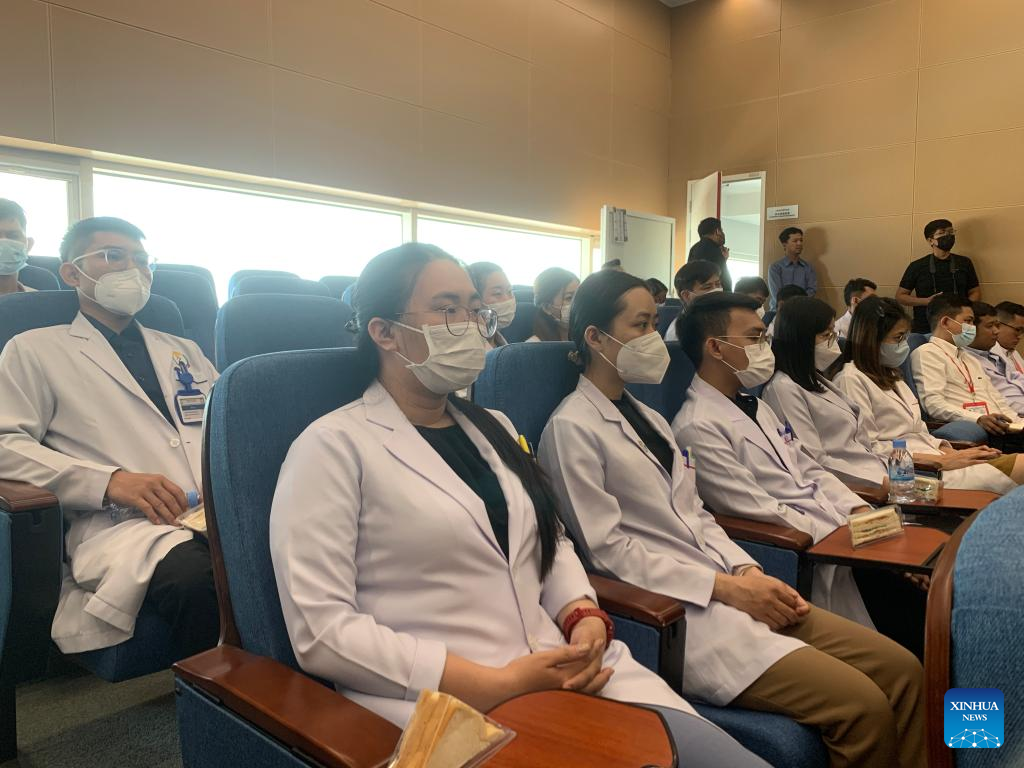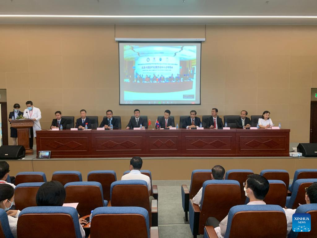 This photo taken on March 3, 2023 shows the opening ceremony of a seminar at the Cambodia-China Friendship Preah Kossamak Hospital in Phnom Penh, Cambodia. Held in a hybrid format, the seminar is part of a project carried out by the Second Affiliated Hospital of Anhui University of Traditional Chinese Medicine to train senior talents of acupuncture and Tuina remedial massage in developing countries. (Photo by Van Pov/Xinhua)