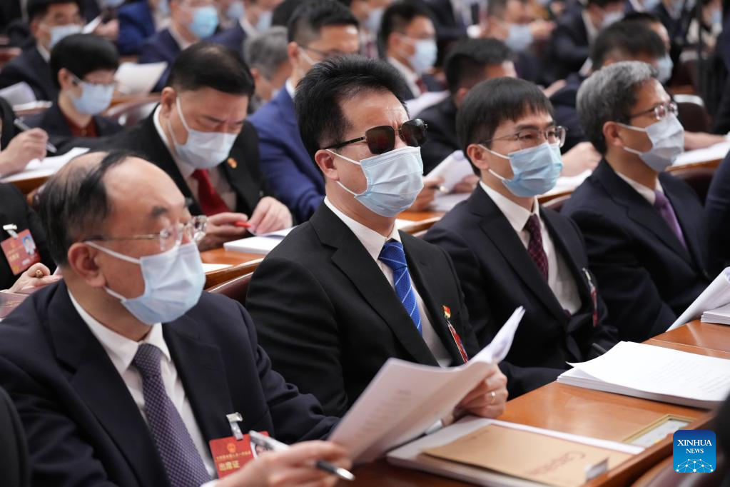 Deputy to the National People's Congress (NPC) Wang Yongcheng (2nd L, front), who is visually impaired, attends the opening meeting of the first session of the 14th NPC at the Great Hall of the People in Beijing, capital of China, March 5, 2023. (Xinhua/Wang Yuguo)