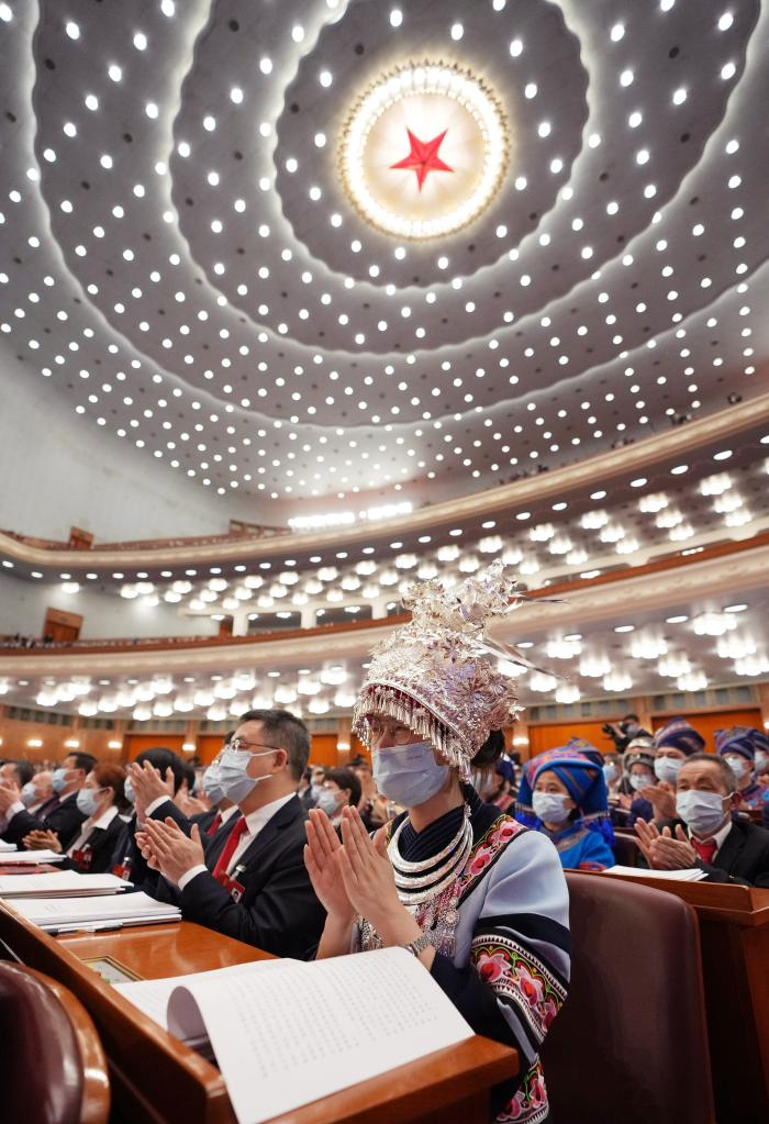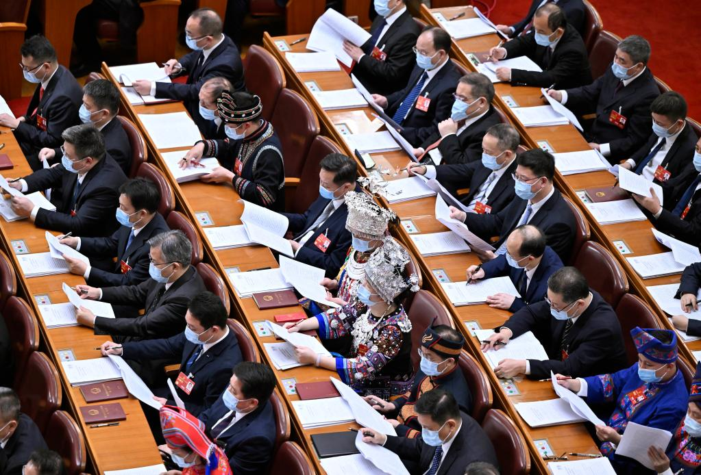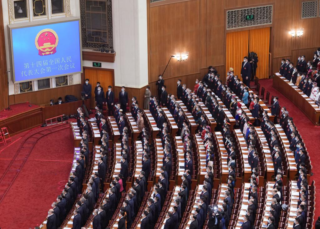 Deputies attend the opening meeting of the first session of the 14th National People's Congress (NPC) at the Great Hall of the People in Beijing, capital of China, March 5, 2023. (Xinhua/Yan Yan)
