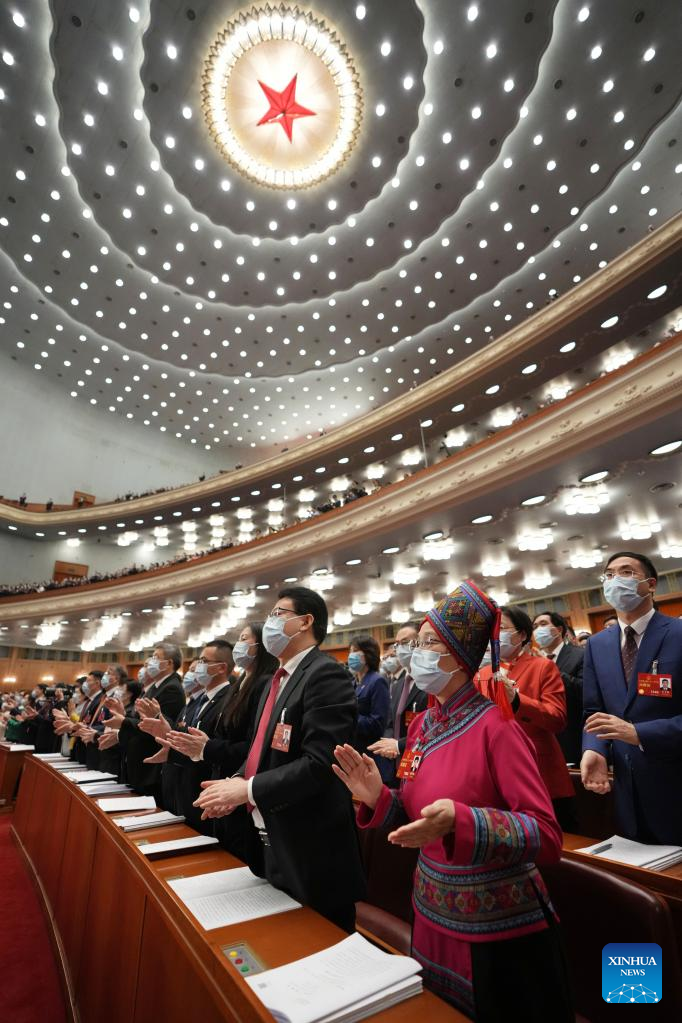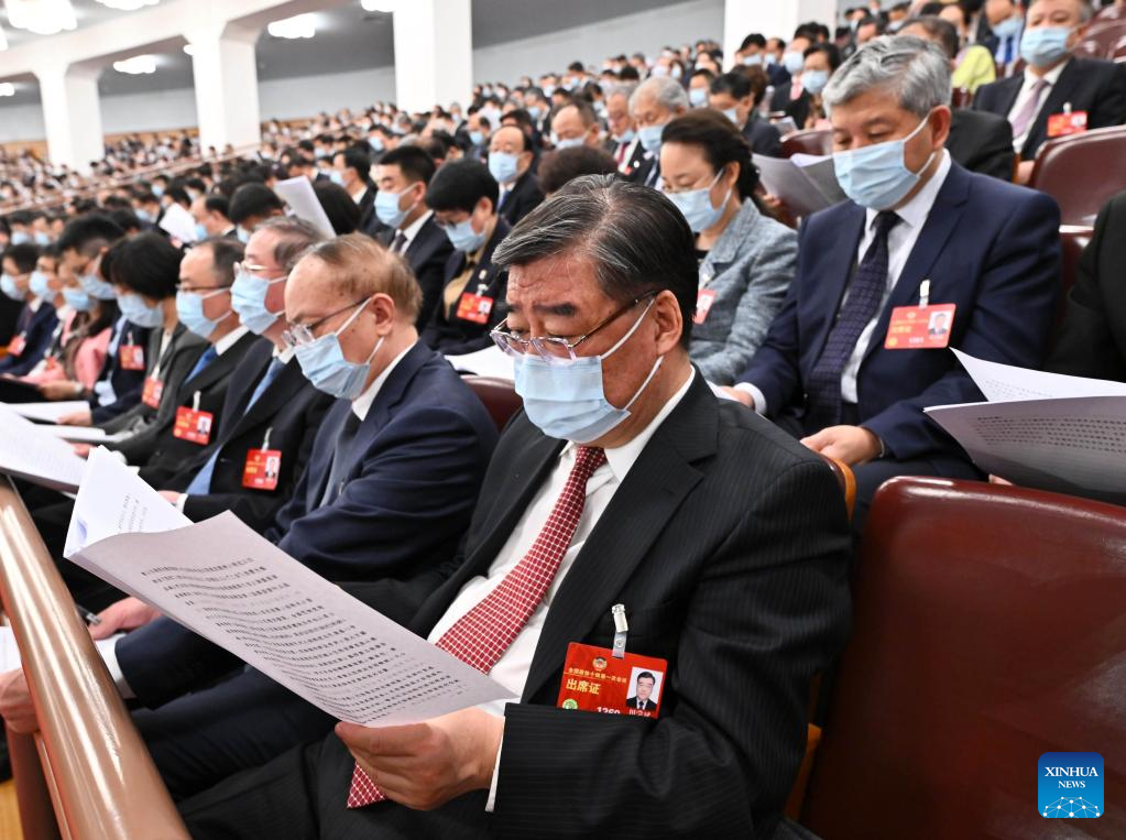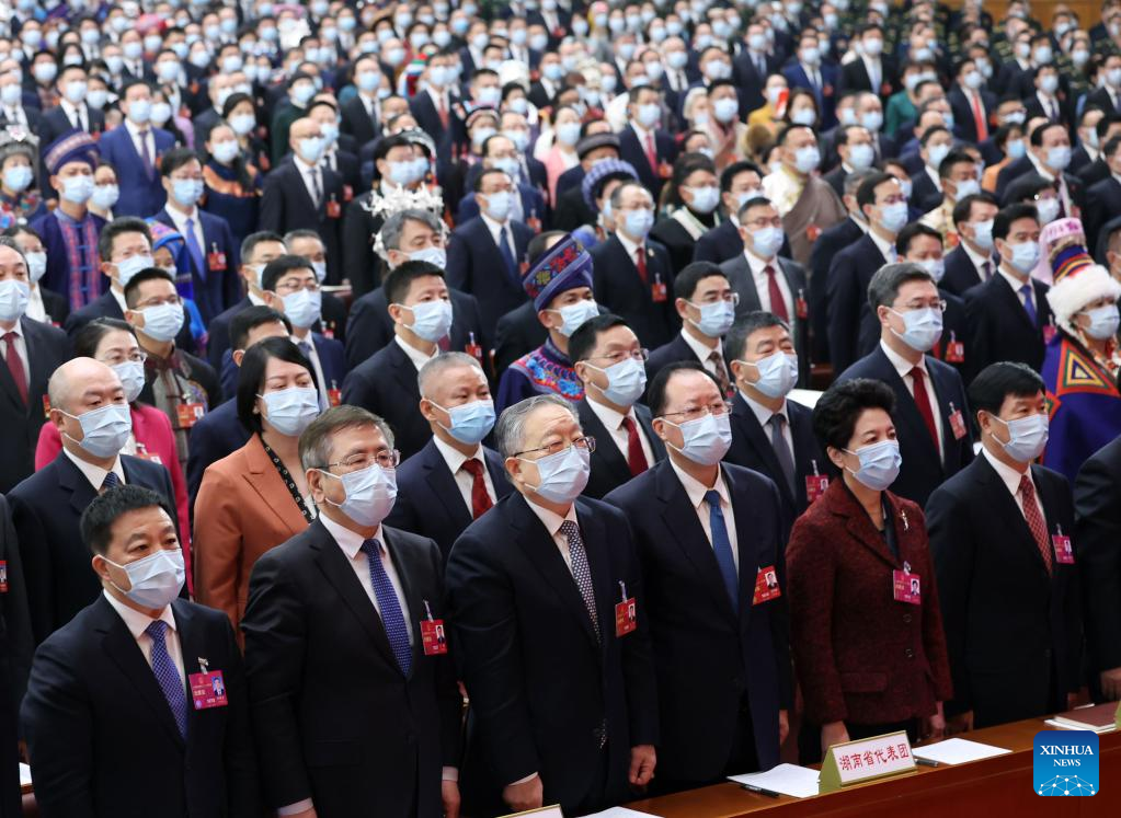The 14th National People's Congress (NPC) opens its first session at the Great Hall of the People in Beijing, capital of China, March 5, 2023. Xi Jinping, Li Keqiang, Li Zhanshu, Wang Yang, Li Qiang, Wang Huning, Han Zheng, Cai Qi, Ding Xuexiang, Li Xi and Wang Qishan attended the opening meeting. Zhao Leji, executive chairman of the session's presidium, presided over the meeting. (Xinhua/Ju Peng)