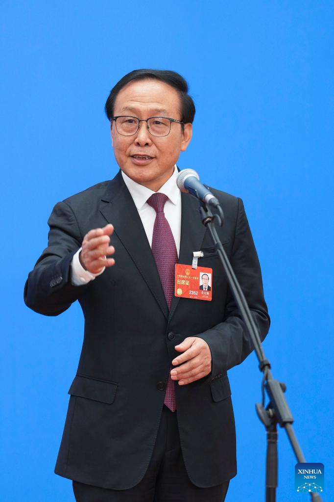 Zhang Keqin, a deputy to the 14th National People's Congress (NPC), attends an interview ahead of the opening meeting of the first session of the 14th NPC in Beijing, capital of China, March 5, 2023. (Xinhua/Cai Yang)