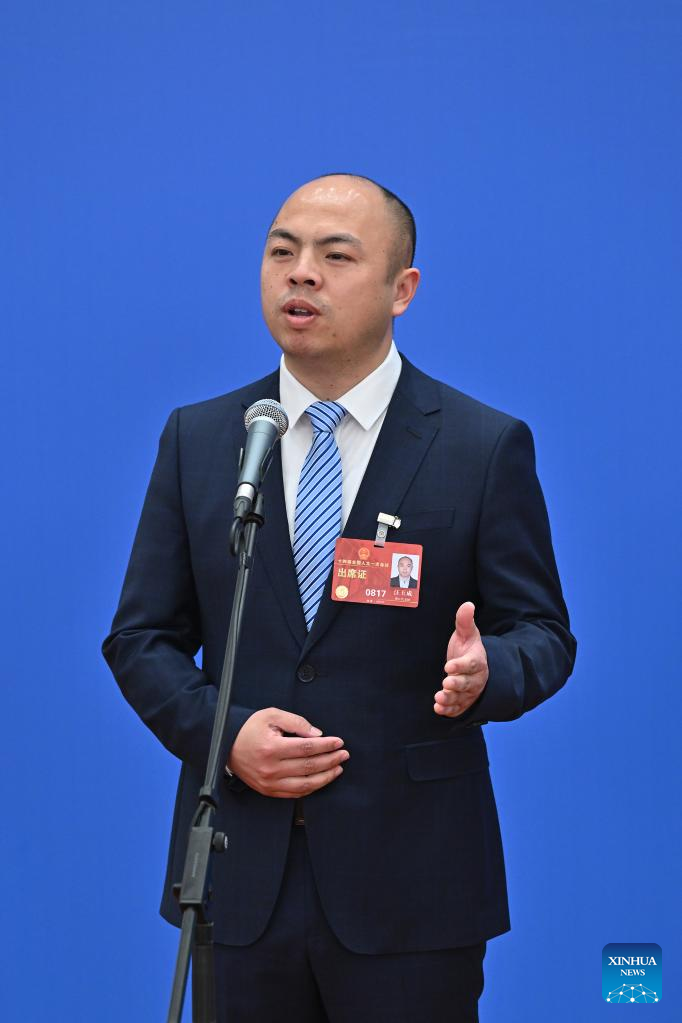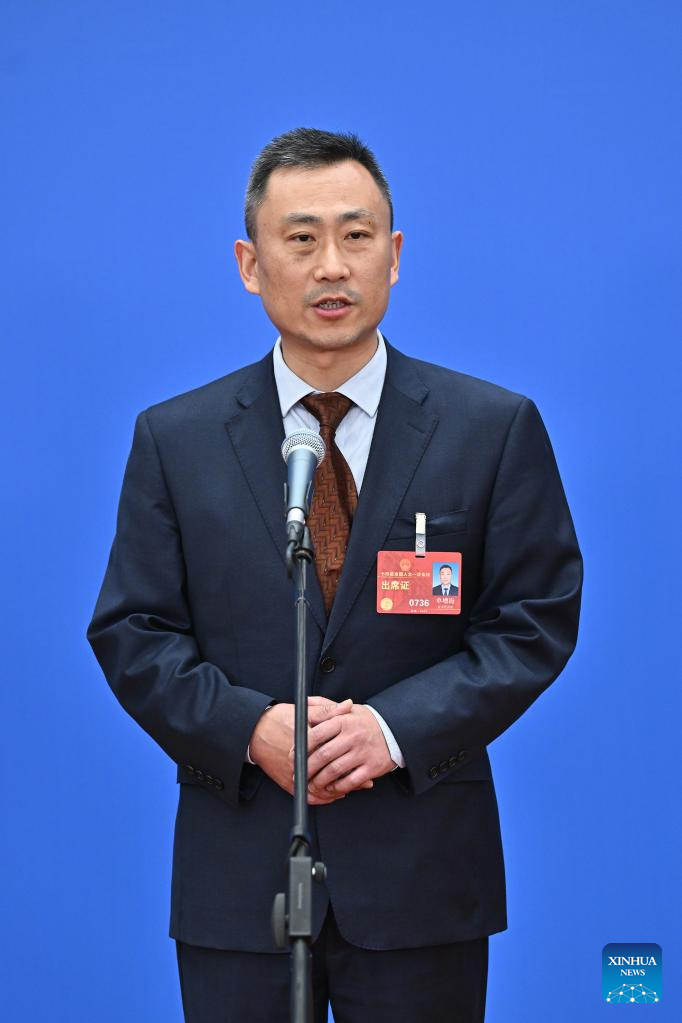 Shan Zenghai, a deputy to the 14th National People's Congress (NPC), attends an interview ahead of the opening meeting of the first session of the 14th NPC in Beijing, capital of China, March 5, 2023. (Xinhua/Liu Jinhai)
