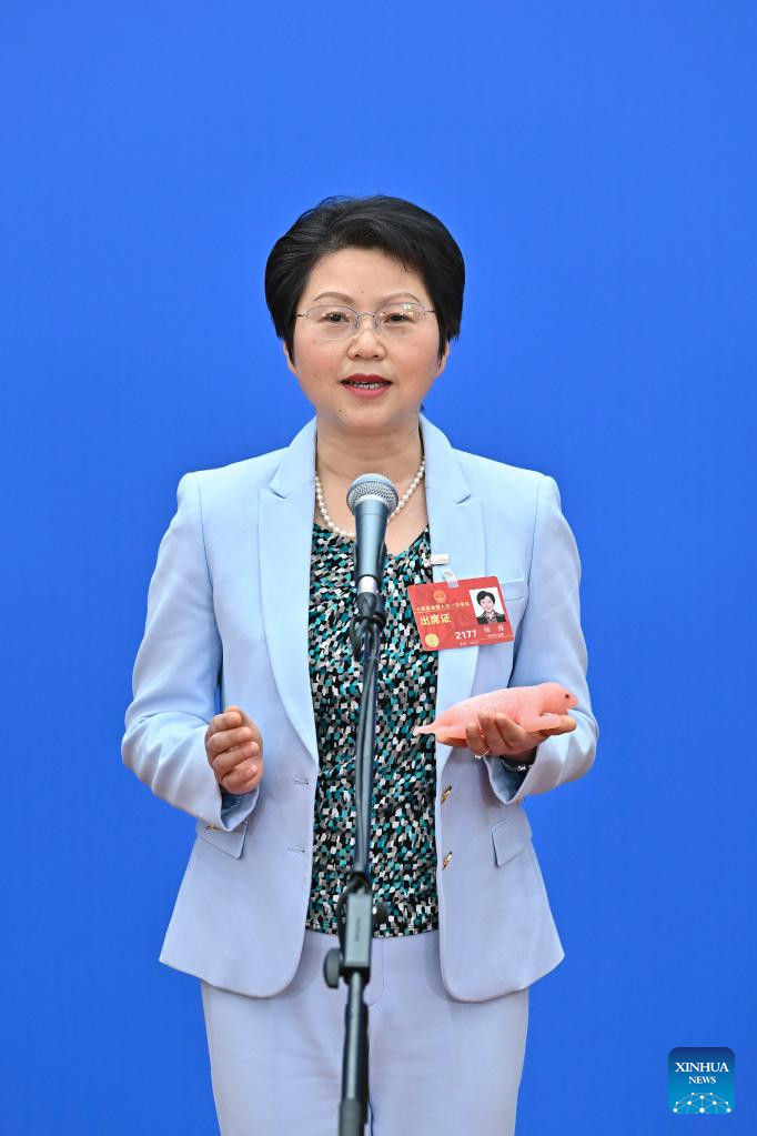 Zhu Yuemeng, a deputy to the 14th National People's Congress (NPC), attends an interview ahead of the opening meeting of the first session of the 14th NPC in Beijing, capital of China, March 5, 2023. (Xinhua/Cai Yang)