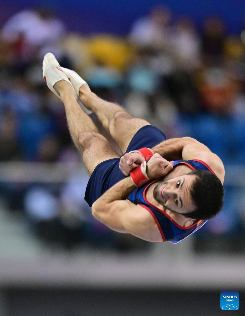 Ahmed Elmaraghy of Egypt competes during the horizontal bar final at the 15th FIG Artistic Gymnastics World Cup in Doha, Qatar, March 4, 2023. (Photo by Nikku/Xinhua)