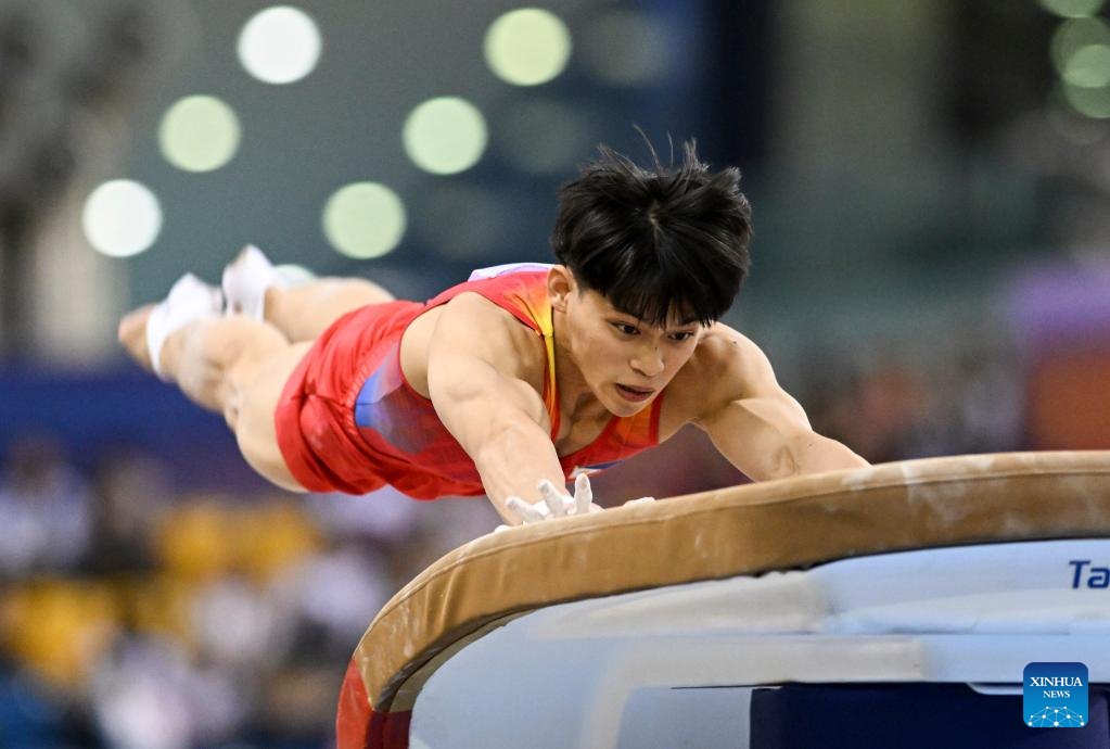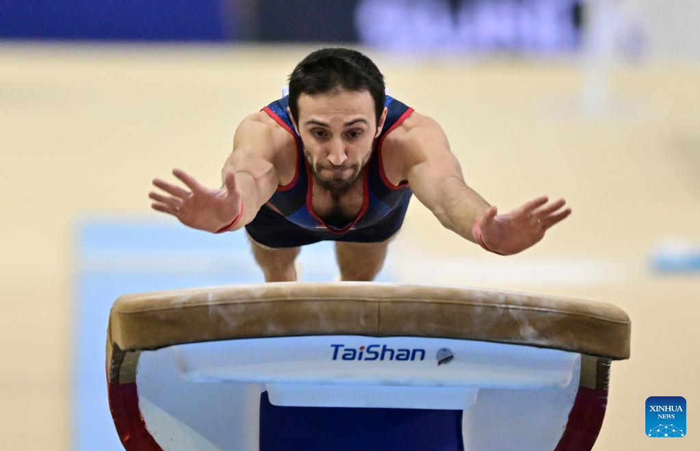 Artur Davtyan of Armenia competes during the men's vault final at the 15th FIG Artistic Gymnastics World Cup in Doha, Qatar, March 4, 2023. (Photo by Nikku/Xinhua)