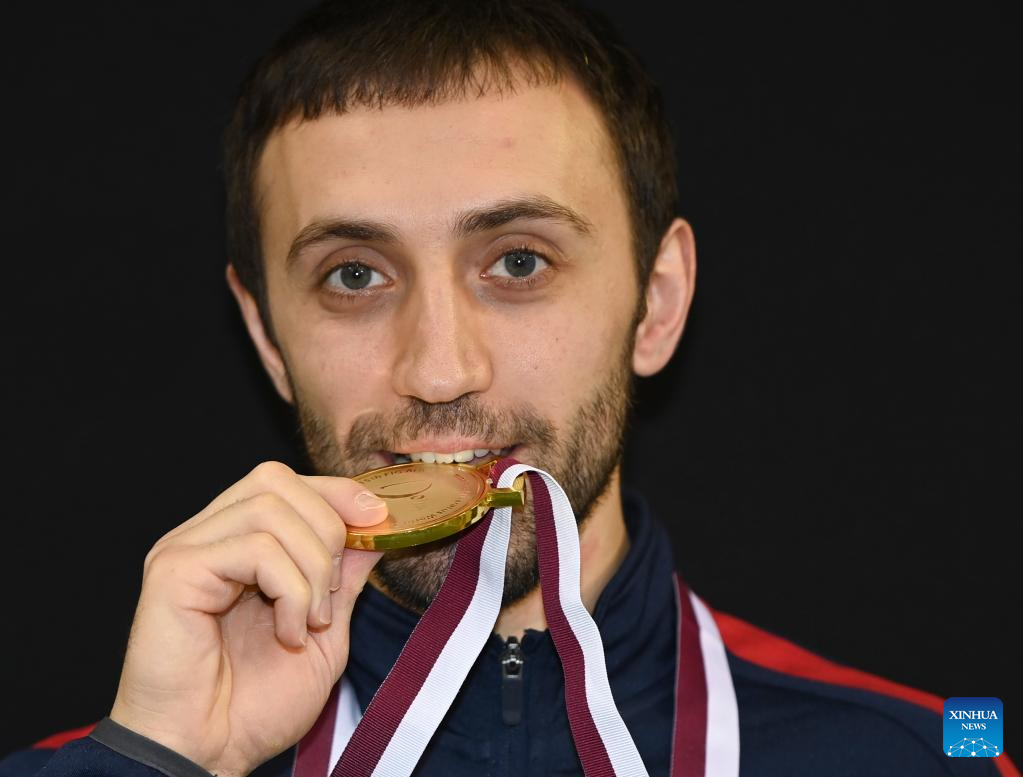 Artur Davtyan of Armenia poses for pictures during the awarding ceremony after the men's vault final at the 15th FIG Artistic Gymnastics World Cup in Doha, Qatar, March 4, 2023. (Photo by Nikku/Xinhua)