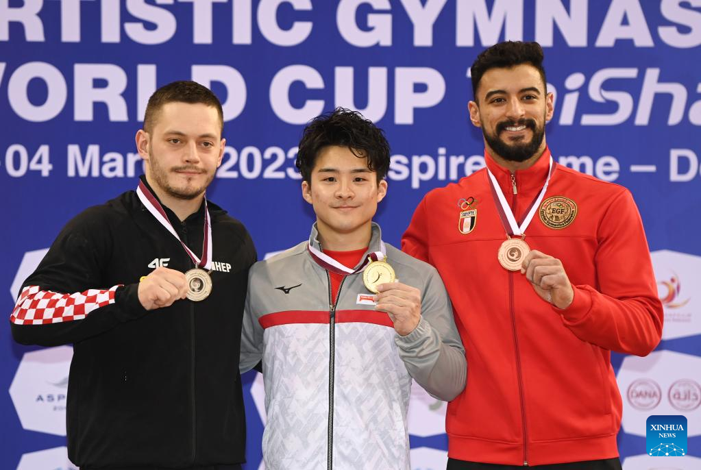 Gold medalist Kamoto Yuya (C) of Japan, silver medalist Tin Srbic (L) of Croatia and bronze medalist Ahmed Elmaraghy of Egypt pose for group pictures during the awarding ceremony after the horizontal bar final at the 15th FIG Artistic Gymnastics World Cup in Doha, Qatar, March 4, 2023. (Photo by Nikku/Xinhua)