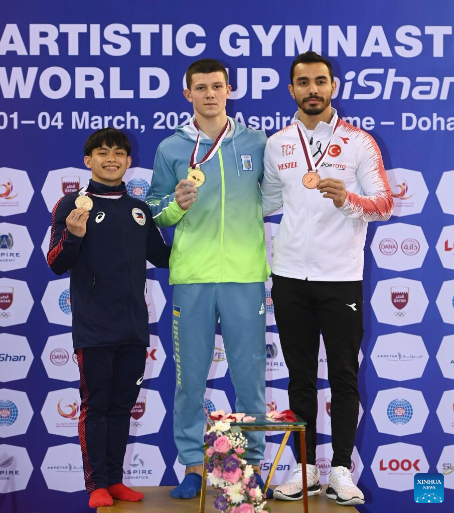 Gold medalist Illia Kovtun (C) of Ukraine, silver medalist Carlos Edriel Yulo (L) of the Philippines and bronze medalist Ferhat Arican of Trkiye pose for group pictures during the awarding ceremony after the parallel bars final at the 15th FIG Artistic Gymnastics World Cup in Doha, Qatar, March 4, 2023. (Photo by Nikku/Xinhua)