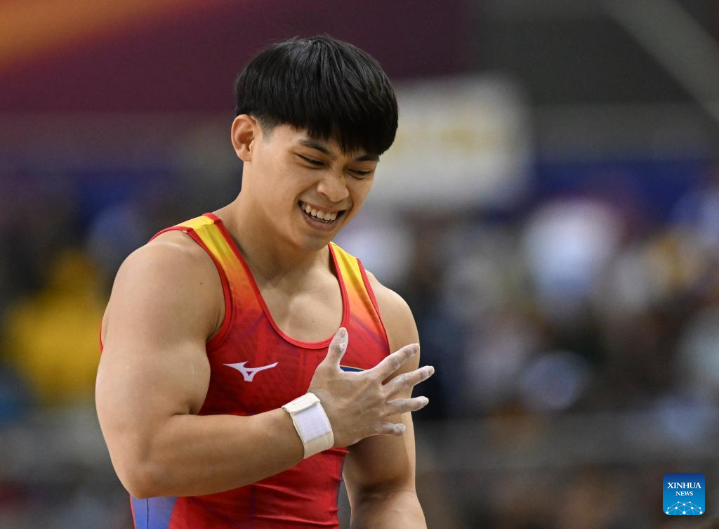 Carlos Edriel Yulo of the Philippines reacts after the parallel bars final at the 15th FIG Artistic Gymnastics World Cup in Doha, Qatar, March 4, 2023. (Photo by Nikku/Xinhua)