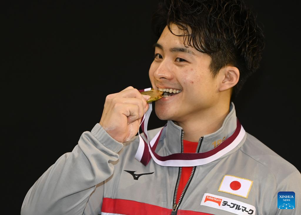 Kamoto Yuya of Japan poses for pictures after the awarding ceremony after the horizontal bar final at the 15th FIG Artistic Gymnastics World Cup in Doha, Qatar, March 4, 2023. (Photo by Nikku/Xinhua)