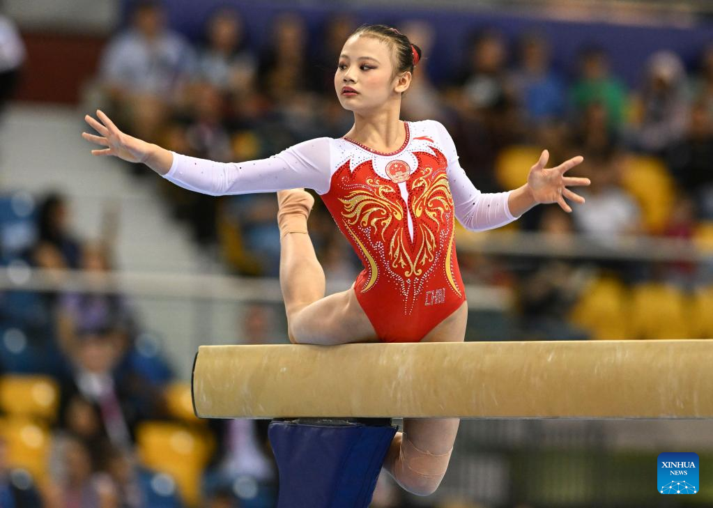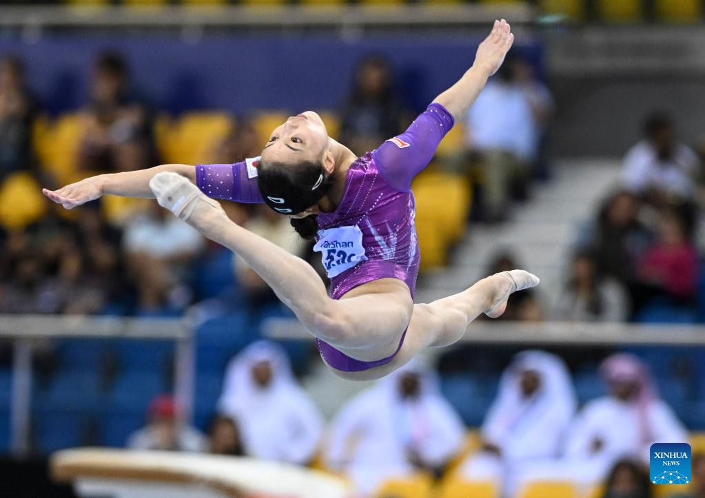 Qiu Qiyuan of China competes during the women's balance beam final at the 15th FIG Artistic Gymnastics World Cup in Doha, Qatar, March 4, 2023. (Photo by Nikku/Xinhua)