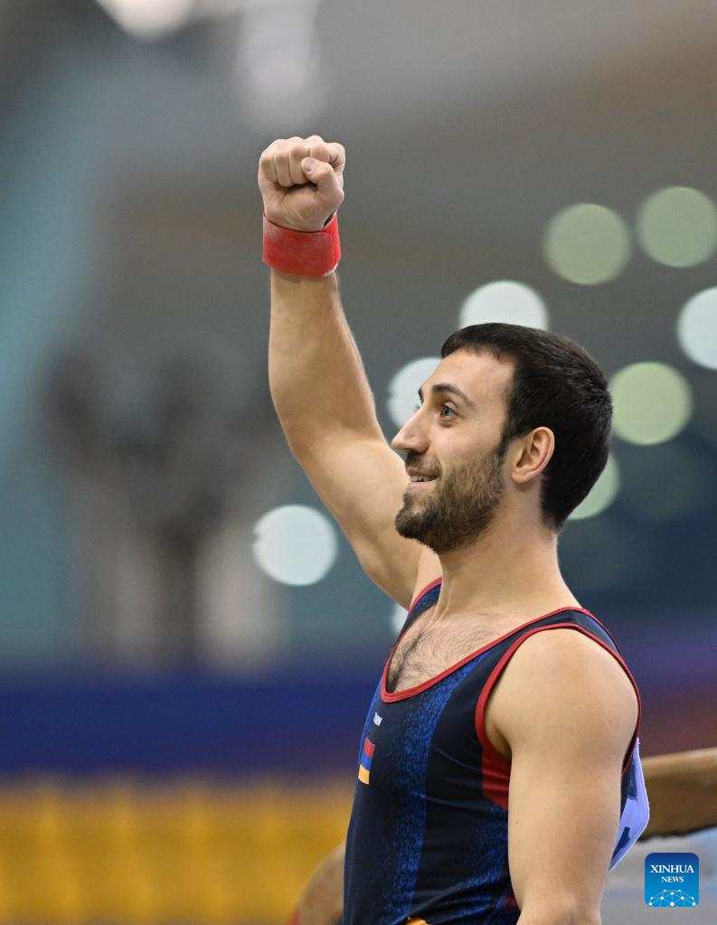 Artur Davtyan of Armenia reacts during the men's vault final at the 15th FIG Artistic Gymnastics World Cup in Doha, Qatar, March 4, 2023. (Photo by Nikku/Xinhua)