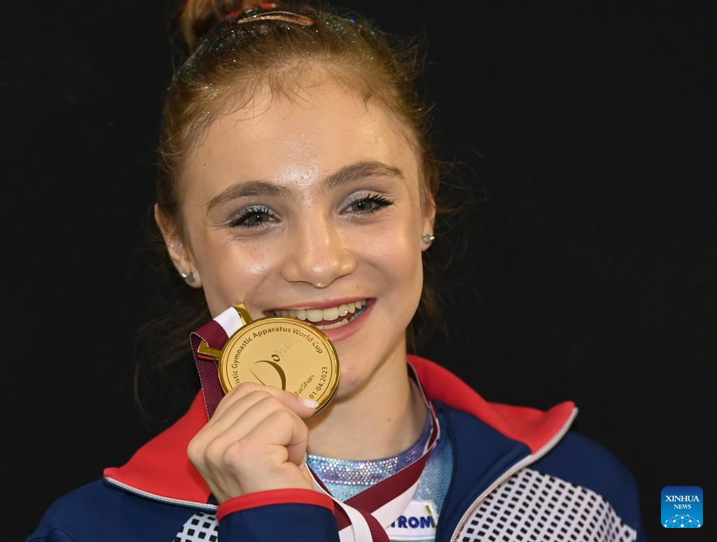 Sabrina Maneca-Voinea of Romania poses for pictures during the awarding ceremony after the women's balance beam final at the 15th FIG Artistic Gymnastics World Cup in Doha, Qatar, March 4, 2023. (Photo by Nikku/Xinhua)