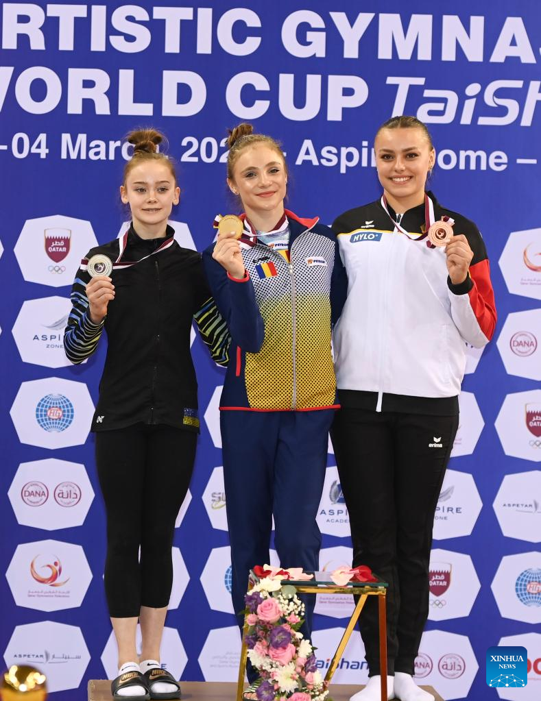 Gold medalist Sabrina Maneca-Voinea (C) of Romania, silver medalist Anna Lashchevska (L) of Ukraine and bronze medalist Emma Leonie Malewski of Germany pose for group pictures during the awarding ceremony after the women's balance beam final at the 15th FIG Artistic Gymnastics World Cup in Doha, Qatar, March 4, 2023. (Photo by Nikku/Xinhua)