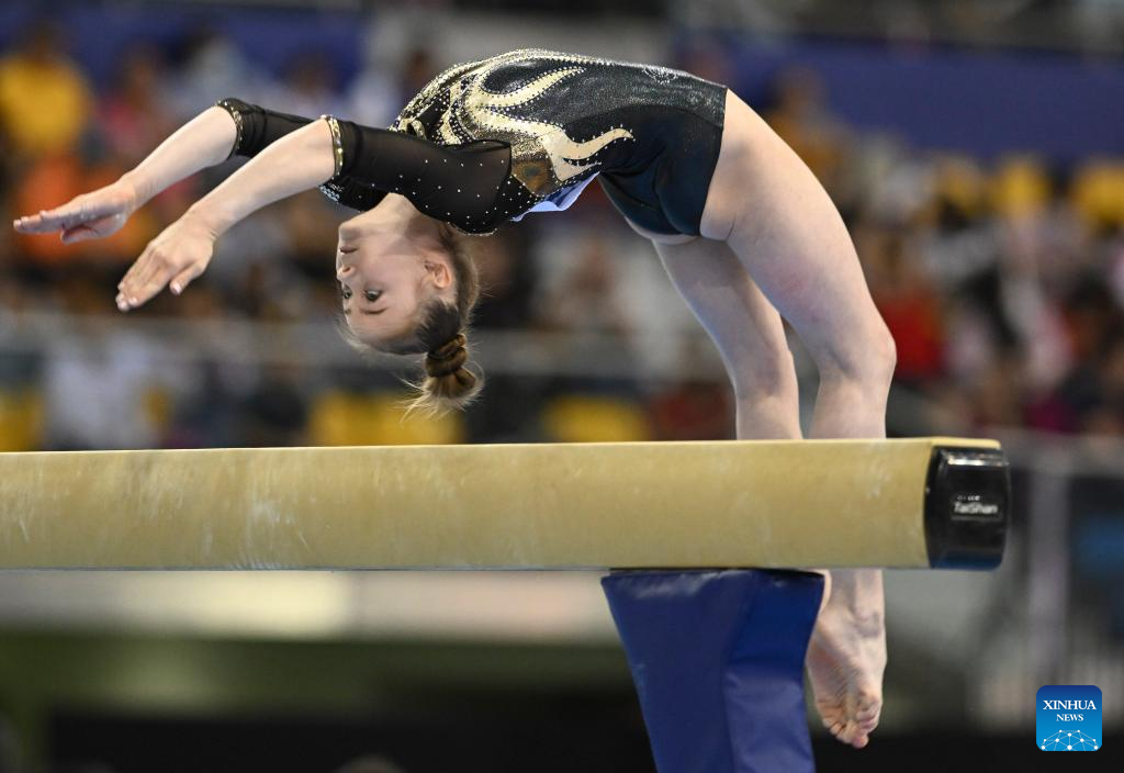 Anna Lashchevska of Ukraine competes during the women's balance beam final at the 15th FIG Artistic Gymnastics World Cup in Doha, Qatar, March 4, 2023. (Photo by Nikku/Xinhua)