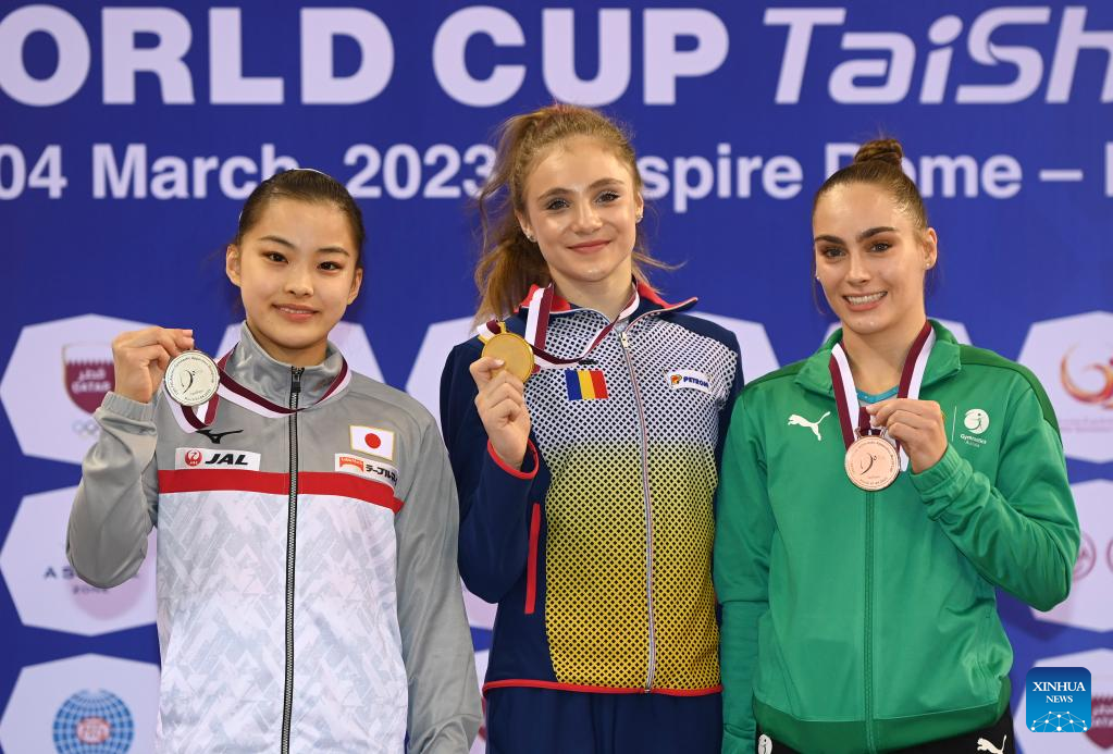 Gold medalist Sabrina Maneca-Voinea (C) of Romania, silver medalist Hatakeda (L) Chiaki of Japan and bronze medalist Breanna Scott of Australia pose for group pictures during the awarding ceremony after the women's floor exercise final at the 15th FIG Artistic Gymnastics World Cup in Doha, Qatar, March 4, 2023. (Photo by Nikku/Xinhua)